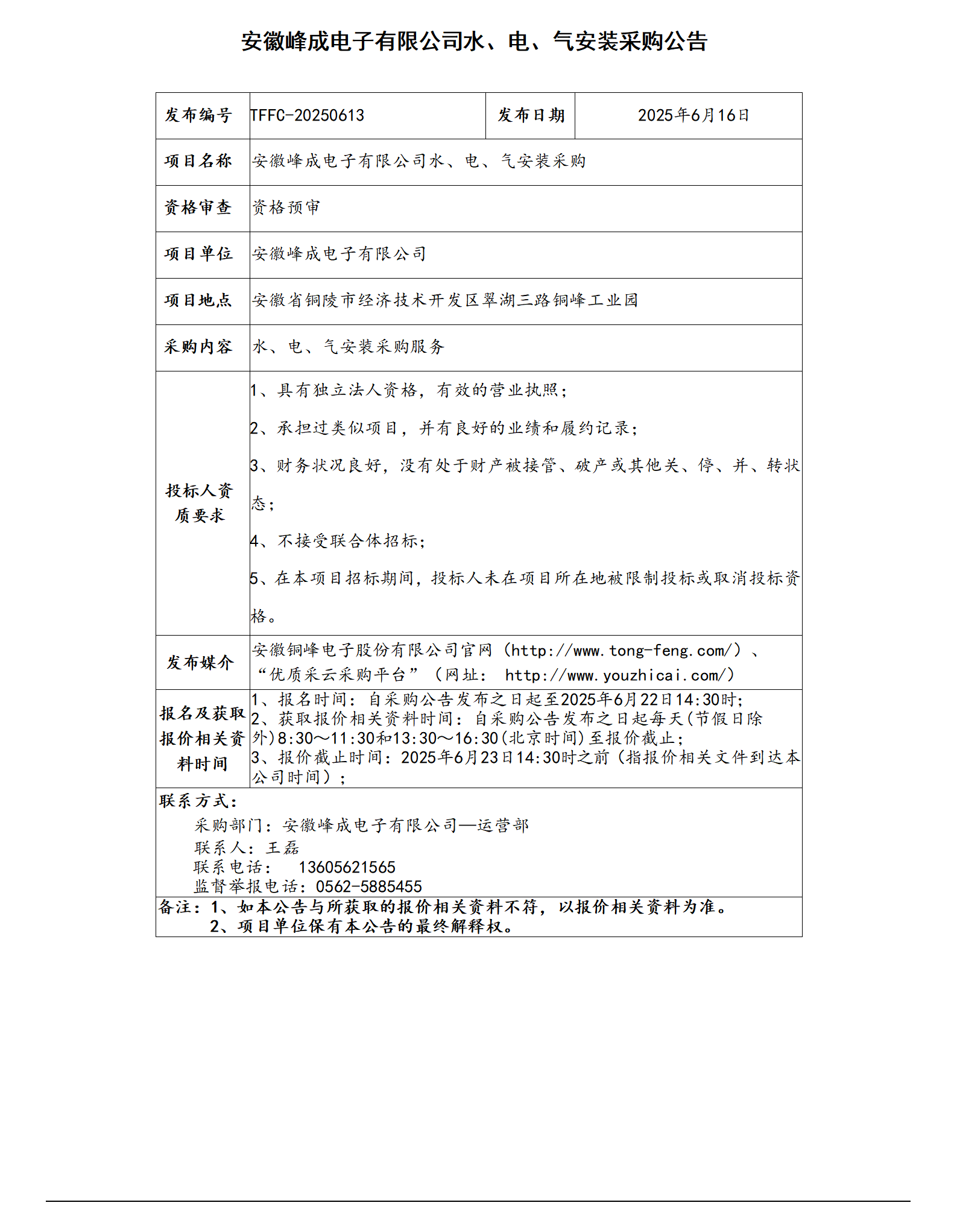 安徽峰成电子有限公司水、电、气安装采购公告_01