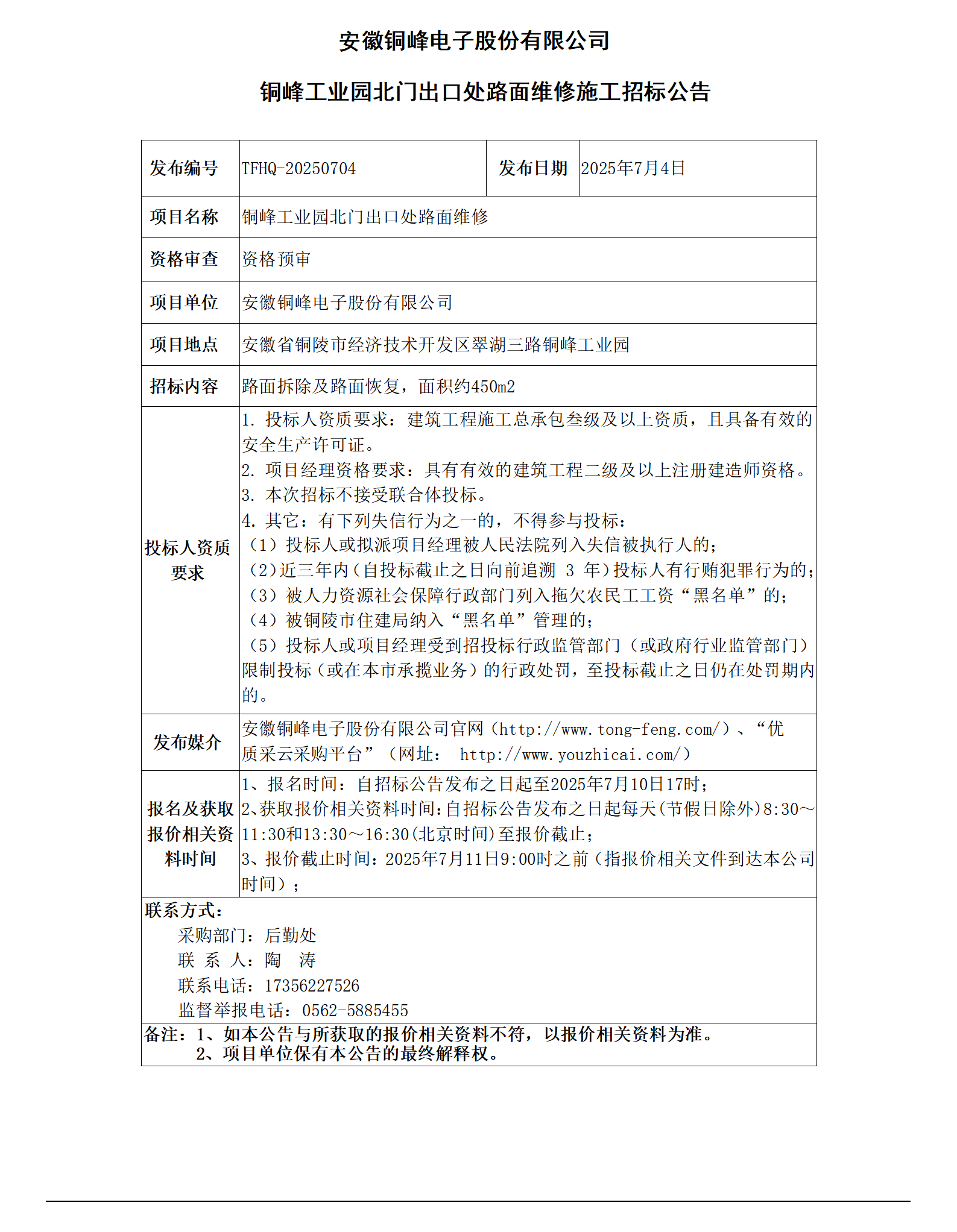 安徽海洋之神HY590电子股份有限公司 (海洋之神HY590工业园北门出口处路面维修招标公告)_01