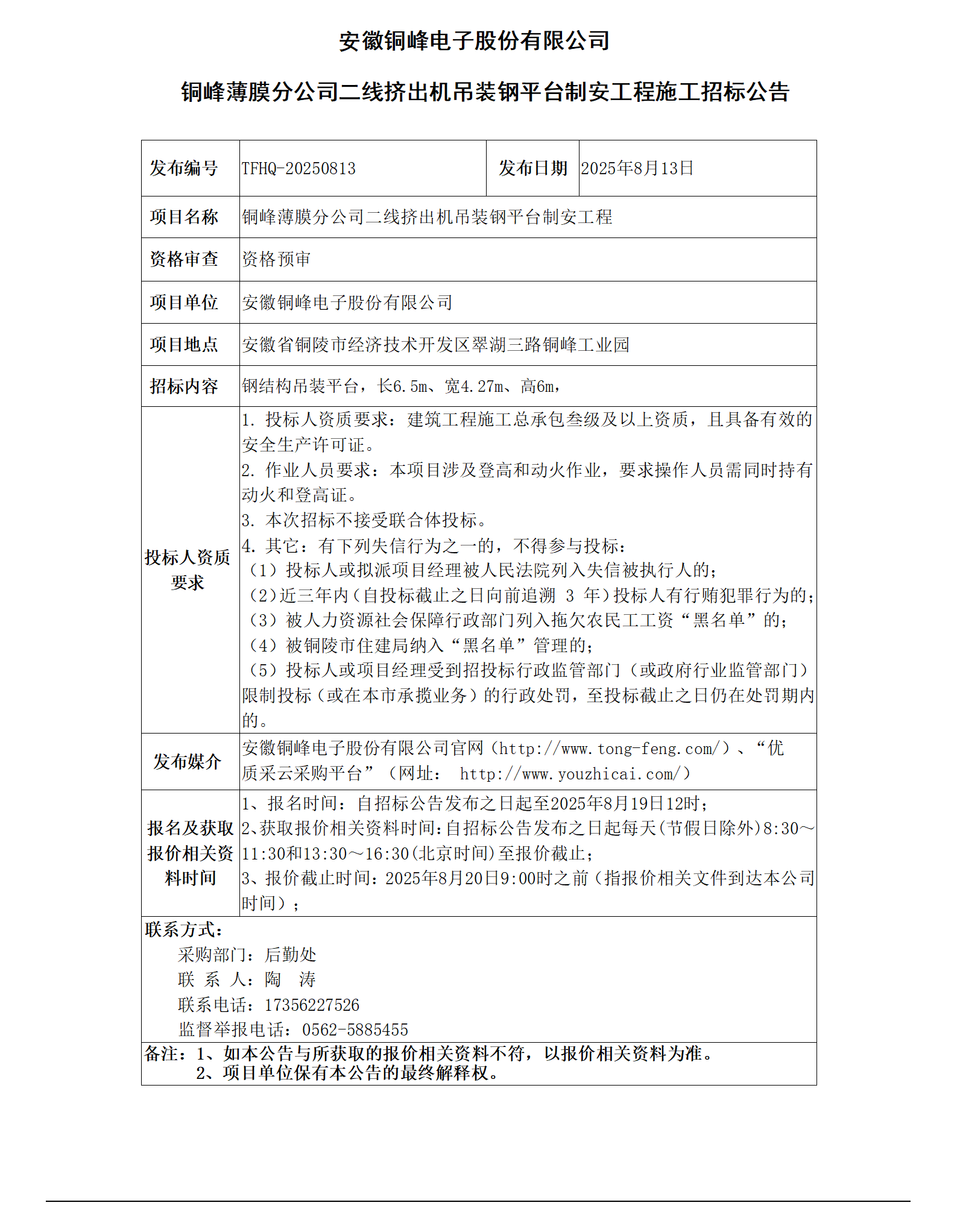 安徽海洋之神HY590电子股份有限公司 (海洋之神HY590薄膜分公司二线挤出机吊装钢平台制安工程招标公告)_01