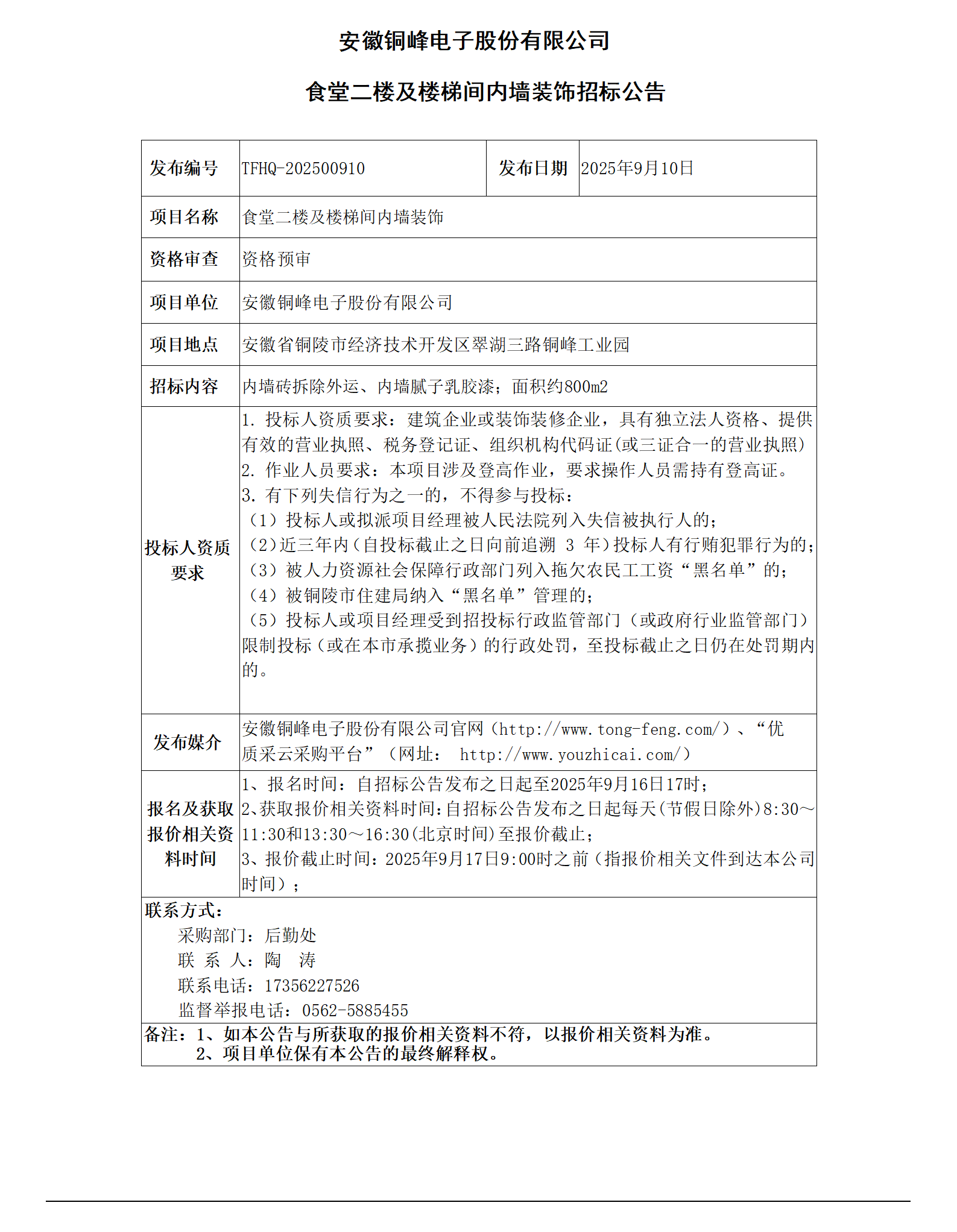 安徽海洋之神HY590电子股份有限公司 (食堂二楼内墙及楼梯间装饰招标公告)_01