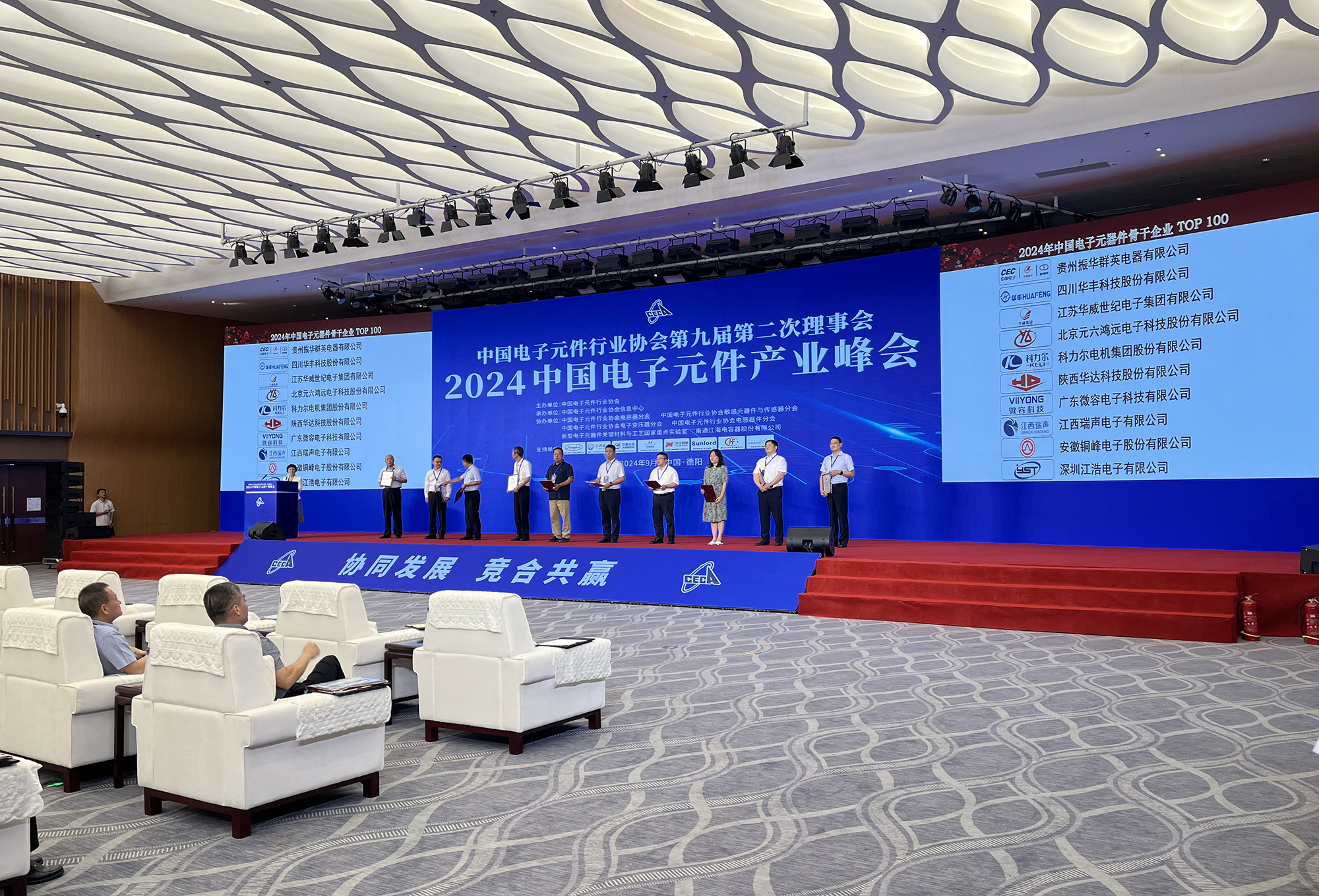 会议过程中,除举办主题演讲、高端对话、分会平行论坛外,还举行了2024年中国电子元器件行业骨干企业授牌仪式,公司再次获评“中国电子元器件骨干行业TOP100 ”荣誉,这是公司连续三十余届入选行业百强。