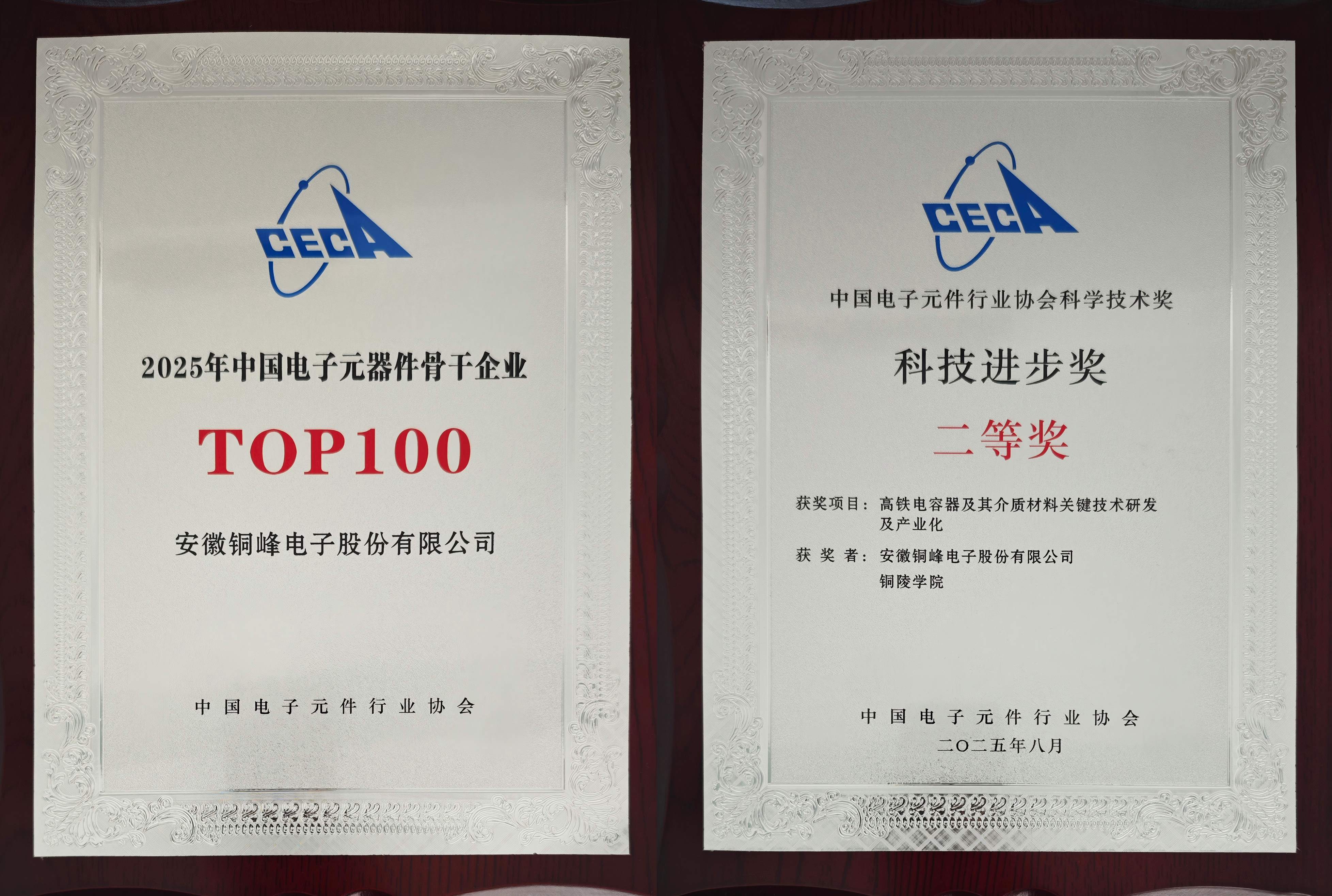 会议过程中,除举办主题演讲、高端对话、分会平行论坛外,还举行了2025年中国电子元器件骨干企业、2025年度(第3届)中国电子元件行业协会科学技术奖颁奖仪式,公司连续三十余届获评“中国电子元器件骨干行业TOP100 ”荣誉,并荣获中电元协科技进步二等奖。